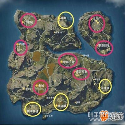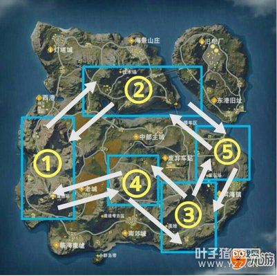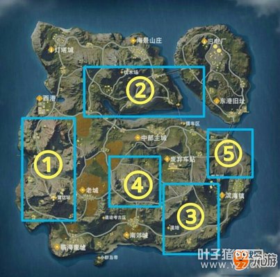 在荒野行动中吃鸡一向都是每一位玩家的梦想,可是跟着很多的玩家涌入,萌新们不知道要怎样玩,也不懂一些吃鸡技巧办法。所以这儿小编就为我们带来了一本吃鸡宝典,包含了道路剖析及下降地址等等的根本攻略,想看的玩家无妨随小编一同来看看吧。 1.要想发育好,落点早找好: 依据降飞机动身方位和飞行时间,尽早挑选好自己的下降地址。不要一味的寻求建筑物多的当地,建筑物越多,遇到的敌人可能性越大,吃鸡的几率就越小(当然,大神在外)。所以,自己依据某一地址下降人数的多少,总结出了下图: 图(1)——红色区域内为下降人数居多地址。黄色区域内为下降人数较多地址。其他区域为下降人数较少地址。 图(2)——蓝色区域内为各个推荐下降区域。