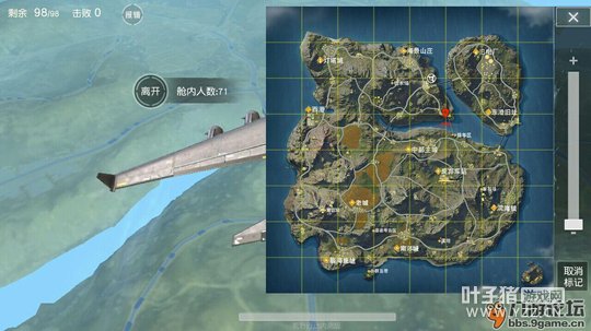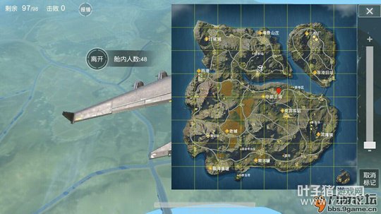 我们可以尽量选择离飞机轨道比较远的地方。根据实战经验表明,现在的玩家非常喜欢降落在离飞机轨道较近的城镇,想降落后第一时间拿到武器大杀一方,然而这是很不明智的选择。 大逃杀游戏为的是吃鸡(第一)而不是杀敌。 根据多把实战经验测试,降落在离飞机轨道较远的城镇几乎都是没有人的,降落后有将近五分钟的时间让你独自搜刮这一片区域,既避免了没必要的战斗,也没有人会跟你抢夺资源。不用担心降落点离安全区的位置有多远,每个城镇都会有车子,马路上隔一段路就会刷出一辆车子。不推荐面包车,容易翻车,速度慢,迫不得已的时候可以用用。 有人担心离飞机轨道太远的话飞不过去,落地后跑过去太花时间了,那就往下看。 【跳伞技巧】 跳伞的时候有两种状态,分别是未开伞跟开伞。 在飞机上选好自己想要降落的地点,先标记上,然后待飞机飞到目标点跟飞机最近的直线距离时再离开机舱。离开机舱后当然不能第一时间开伞,先在屏幕中找到自己标记好的点。如下图