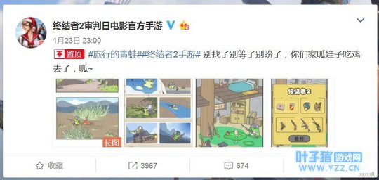 而荒野行动的兄弟手游终结者2:审判日更是直接在自家的官方微博直接po出系列漫画,用旅行青蛙为自己宣传了一波~