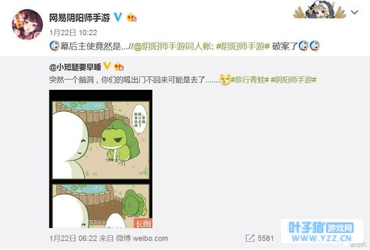 就连火了一年多的阴阳师也不得不正视小青蛙的人气,有位玩家把SSN呱和旅行青蛙糅合一起画出来的漫画受到了官方的转发评论。那小叽我养的青蛙一定是大天狗呱!