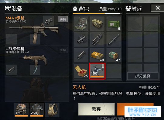 2.电量100:大约200秒的时间,电量耗尽后无人机会直接摧毁,期间可以“回收”,在屏幕的右边有个按钮。回收需要3秒的“操作时间”,就像使用药品一样。 3.容量80:背包记得清一些空间给它。