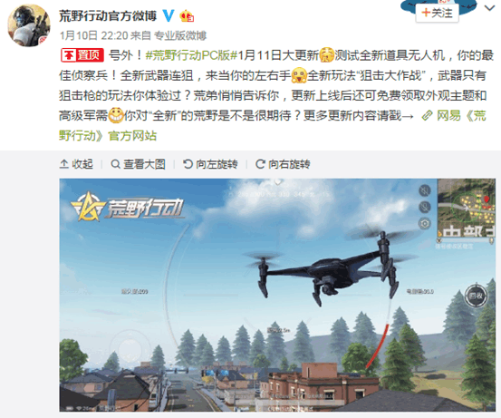 枪战类型手游荒野行动因一直以来都存在BUG过多,外挂行为泛滥,在1月11日迎来了一次重大更新。在本次更新中推出了新的道具无人机和新型武器连狙,算是对玩家们抱怨游戏内容过于单调的回应。