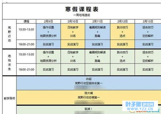绝地求生以及荒野行动的寒假补习班?这也太可怕了!小编在不知不觉中又错失了一个赚五百万的机会啊! 阿离我懊恼了一阵后,开始对这个游戏补习班进行了一番研究! 首先从课表上来看,这个所谓的一周吃鸡补习班主要是分为了两个部分,PC游戏的绝地求生以及手游的荒野行动! 教程时间以及内容似乎是完全一致!然后再来看看请来的这些名师,都是一些主播! 小编也很是好奇的特意去网络上搜了这些主播,当然,在名气方面确实是差了很多!至于游戏实力,小编不得而知,毕竟没有深度观察过!