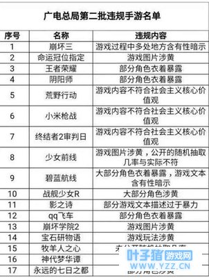 2018年的第一个月,广电要出重拳整顿整个手游市场,现在手游市场算是乱项丛生,很多手游不光内容涉性暗示,连游戏名称都三观不正。 1月17日在网上流传的一份手游违规名单,里面列出了广电最新的一批手游违规名单,上榜的游戏几乎都是时下最热门的游戏。里面很多都是现象级的手游,王者荣耀,阴阳师,时下最热的三款吃鸡手游荒野行动、小米枪战、终结者2审判日都位列其中。更是有运营了很多年的QQ飞车。 违规的内容主要为: 1.涉黄 2.衣着暴露 3.游戏内容不符合社会主义核心价值观 4.未公开随机抽取道具的几率及公开的几率与实际不符。