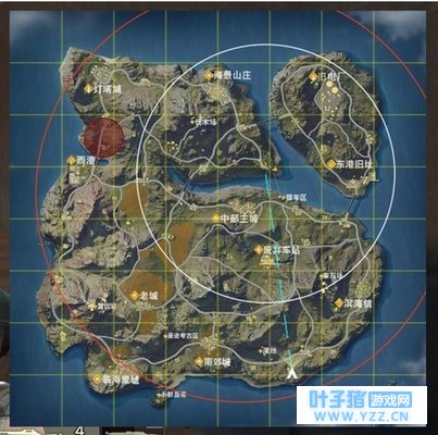 《荒野行动》信号圈范围 不过当地一个信号圈来袭的时候大可不必着急,如图,第一个安全区域非常的大,当第一波信号圈缩小时,会有多半时间在海里,而就算没有赶上红圈也不要紧,第一个红圈掉血非常缓慢,等物资收集好了在安心进入安全区即可。 但需要注意的是当第二个红圈到来的时候就不可以在外面乱晃了,因为此时白圈的区域会对玩家造成很高的伤害,随着信号圈的缩小,圈外的伤害会越来越高,这时就需要提前预判下一个安全区的大概位置,占领有利位置以静制动。 地形的划分 在野外就不得不要熟悉地形的划分,有时候野外的树木和石头也是很好的掩体。整个地图大致上分为四大块,石地、草地、山坡、麦田。