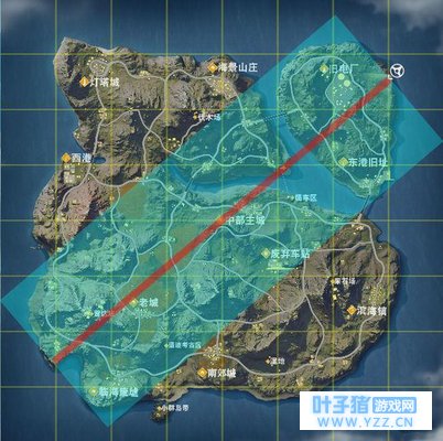 《荒野行动》地图物资分布图(图片引自微博) 刚才也说到了,跳伞区域的选择首先是要根据航线来定,如图,这种航线就是最理想的航线状态,飞行距离长,地图跨度大。蓝色区域为跳伞滑行最远可以到达的地点。可以看到航线经过了中心城区,老城这样的物资丰富的地点,但那里也是人最多的地方。也可以跳伞之后往北边的西港进发,那里人少可以专心发展。