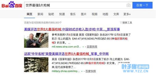 官方给出了三个关键词——国产、明星武器、步兵标配,这个范围还是有一点大的。不过再仔细阅读,官方还给出一个信息——新武器曾被美媒称作世界5大最强机械之一! 怀着激动忐忑的心情,小编默默地打开了百度—— 输入“世界最强5大枪械”——