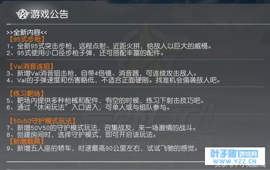 【新内容】 : 练习靶场, 休闲玩法入口,应该是练习枪法的。 50V50守护模式, 好像需要创建房间才行。 新增载具, 5座的轿车,时速90,起飞吧!