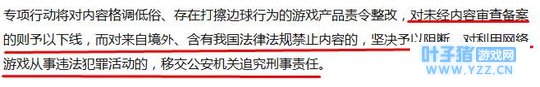对未经过内容审查备案的游戏将给予下线,对境外、法律禁止的内容给予阻断。对利用网络游戏从事违法活动的,将追究刑事责任。