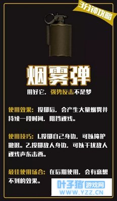 烟雾弹丢身边可以掩护队友,丢敌人那边可以迷惑对手,丢没人的空地可以误导敌人,决赛圈用有奇效,有时候以少打多就靠它。 五、最后圈打药技巧