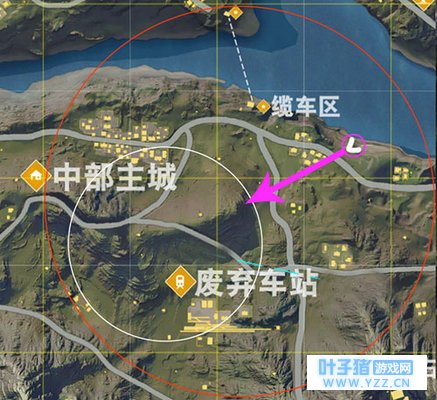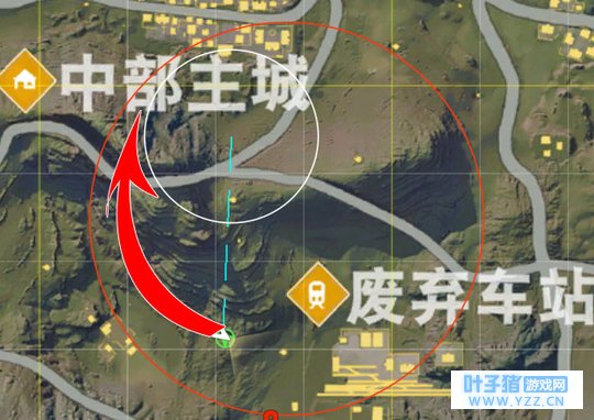 荒野行动 如果最后的信号圈是如上图这样,与一边贴的很近,而你的位置助于一边,那可以选择从近的那边切入,如果看到人还可以顺势清掉。 说明:决赛圈很痛,圈外基本不可能有人,而选择切入可以保证你的后方没人,这样可以专注观察前方。 第二种:贴圈直入式