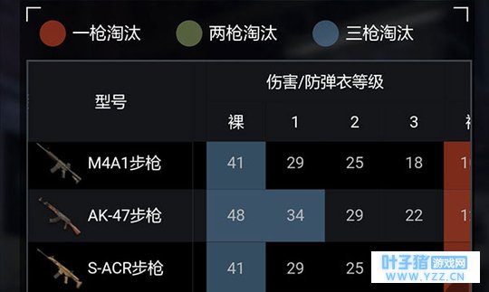 荒野行动 数据分析: 一、防弹衣 防弹衣减伤公式:武器基础伤害*(100%-防弹衣减伤比例)=你受到的伤害 防弹衣耐久损耗=武器基础伤害(PS:即使最后剩余1耐久也能减少全额的伤害) 例如AK打三级甲一枪:48(AK伤害)*0.45(100%-55%)=21.6。耐久掉48。 AK要击倒一个三级甲的玩家需要5枪,一枪耐久度-48,三枪耐久度-144,剩余1;剩余1点耐久防御第四枪,然后第五枪倒。 145耐久度的三级甲——前四枪受到伤害:4×48×0.45=86.4,再中第五枪死亡 而击倒一个任意耐久二级甲的玩家只需要4枪。 同理: 5.56步枪(SACR和M4A1)的基础伤害是41,身穿三级甲,每一枪打到身上都会承受41*(1-0.55)= 18.45点伤害,6枪才会倒。6枪之前都有防弹衣罩着你,也就是说防弹衣起到5枪的抵御效果,那么41*4+1=165点耐久以上的三级甲,在面对5.56步枪的时候,可以抗住6枪,而崭新二级甲最多也就是5枪。