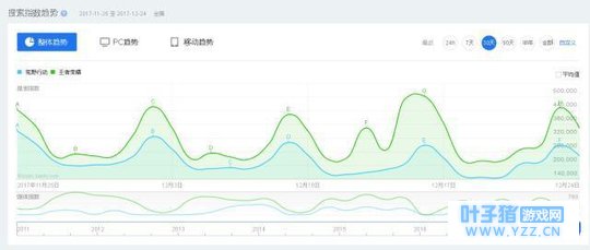 从百度指数上看,《荒野行动》一直也没有完成“超越”《王者荣耀》的使命,相反,在12月15日前后,因为《王者荣耀》的新英雄上线的节点,直接将《荒野行动》甩在了身后。