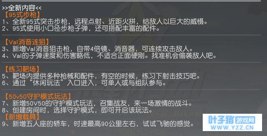 【95式步枪】 1、全新95式突击步枪,远程点射、近距火拼,给敌人以巨大的威慑。 2、95式使用小口径步枪子弹,还可搭配丰富的配件。 【Val消音连狙】 3、新增Val消音狙击枪,自带4倍镜、消音器,可连续攻击敌人。 4、Val的子弹速度和伤害略低,不适合正面硬刚。找准机会偷袭敌人吧。 【练习靶场】 5、靶场内提供多种枪械和配件,有空的时候,练习下射击技巧吧。 6、通过“休闲玩法”入口进入,可单人或与组队参与。 【50v50守护模式玩法】 7、新增50V50的守护模式玩法,召集战友,来一场激情的战斗。 8、创建房间时,选择守护模式,即可开启该玩法。 【新增载具】 9、新增五人座的轿车,时速最高90公里左右,试试飞驰的感觉。
