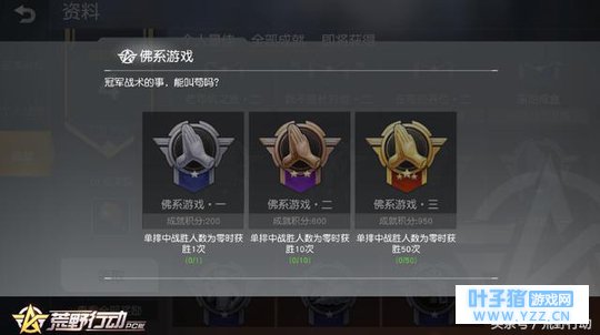 但是最难的成就还是要数这个“佛系游戏”成就,要求单排战胜数为零时获胜次数分别达到1、10、50。 仅仅是获胜这个条件就已经不简单,还要求零战胜,并且获胜次数高达50次,真的没有比这还要难的成就任务。 这个成就任务的出现,无疑会使更多的玩家加入“伏地魔”、“老苟”的行列中。各位战友,你们准备好了吗?