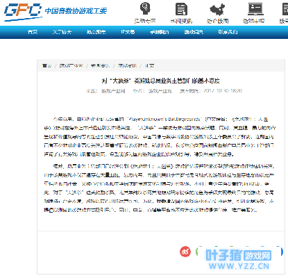 各位小伙伴们大家中午好呀!又是激情吃鸡的一晚过去,不知各位小伙伴昨晚的游戏体验如何?有没有大吉大利,今晚吃鸡? 昨天,小编的一篇题为《绝地求生:国服过审再度失败!原定的内测计划成泡影!》受到了小伙伴们前所未有的关注,那么今天就来放出一些相关事件的后续分析吧! 早在17年10月30日,绝地求生或将引进国服的资讯闹得沸沸扬扬的那阵子,中国音数协游戏工委就发表过一篇题为《对“大逃杀”类游戏总局业务主管部门的基本态度》,原文如下: