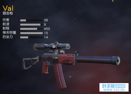 AWM狙击枪 Val狙击枪是荒野补漏中最新推出的,整个的一个伤害虽然只有AWM狙击枪的一个零(基础伤害))但是他自带一个倍镜和消音,射速达到了空前的9发,就比M4步枪少了3发而已,小编曾经靠它近战撸过好几个拿步枪的,哈哈 手感非常的不错 ,个人觉得它可以算是狙击之王。不说了 开撸去了 祝大家 大吉大利今晚吃鸡!