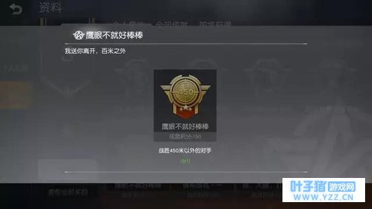 鹰眼不就好棒棒:成就要求450米以外击杀敌人。移动端想完成这个成就太难了,离得远一点几乎就看不到人了,除非是受到了幸运女神的眷顾了啊!