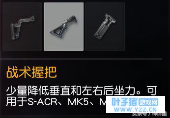 MK5枪托 唯一的一把单独配件,减小水平后坐力、略微降低垂直后坐力,还可以加快后坐力恢复,三种握把中后坐力减小最少。 三种握把的属性对比