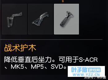 战术握把 战术握把可以少量降低枪支的后坐力,稳定性来说还不错,只是后坐力降得有些少。 战术护木
