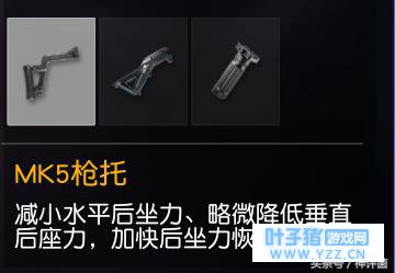 战术护木 只降低枪支垂直后坐力,三种握把中后坐力减少程度略胜一筹。 MK5枪托