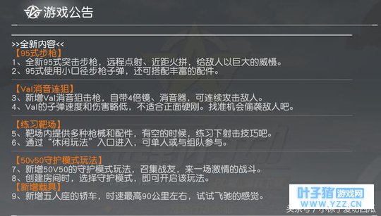 3.全新内容。 这次更新的全新内容惊喜还是有的,新增了一个50V50的守护者模式玩法,不得不说,网易的创新能力确实是很强,虽然游戏画质没有绝地求生那么精美,但是对硬件要求到也不高,满足了大量没有很高配置电脑的玩家需求,而这次带来的全新模式,确实也让人很期待!而95式步枪,Val连狙,轿车和练习靶场,在上次的更新中已经就有了,在这里就不给大家赘述了。