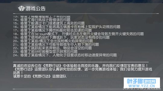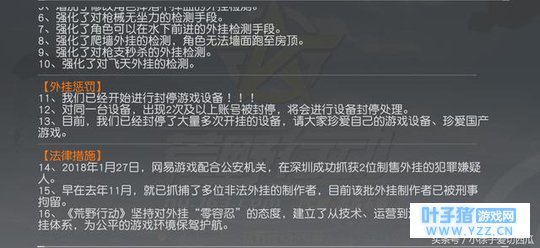 反外挂 1.网易这次更新将反外挂放在公告的头一位,由此可见,网易对于外挂问题的重视。本次更新之后对大量bug,不掉血,无敌,水下前进,爬墙等外挂进行侦测手段,相信此时一大批荒野行动外挂玩家,又要和自己的外挂生涯说拜拜了。对于外挂,小编想告诉大家的是,千万,千万,千万不要开外挂! 外挂换来的游戏快乐并不是真正的游戏快乐,外挂只会破环游戏平衡,给占大部分的不开挂玩家造成心理阴影,用外挂换来的游戏体验是建立在别人的痛苦之上的! 这样做真的不好,而且网易这次的反外挂力度绝对是史无前例的,对于2次及以上的开挂玩家,直接封停设备!而且在2018年1月27日,网易配合公安机关,在深圳成功抓获2位制售外挂的嫌疑人。目前已经被刑事拘留了!
