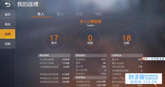中队模式 在PC版中,通过点击战绩可以查看自己的吃鸡记录,每一次比赛完毕都会有所更新。而这个段位分就隐藏在排名相关这一列里,段位分就隐藏在综合得分这一行中,每次比赛完毕都会有所变化。 为了验证,小编用单人模式进行了测试