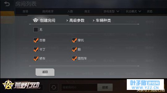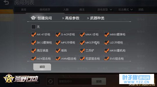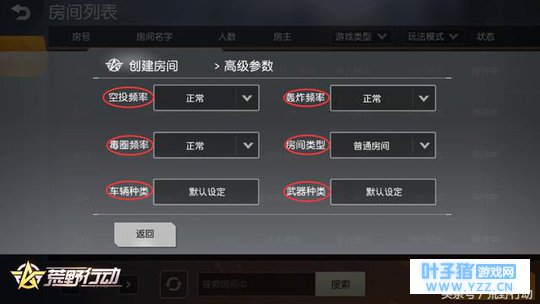 高级参数能够设置空投频率、轰炸频率、信号区缩减速度、房间类型、车辆种类和武器种类。