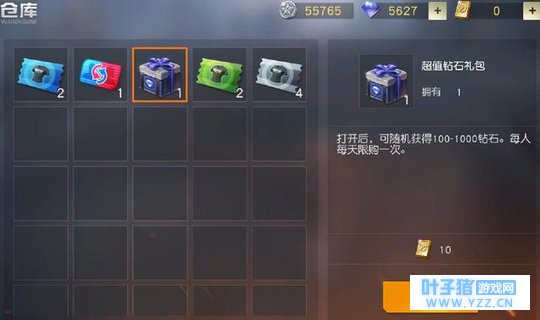 完成任务后你再去仓库找你的钻石礼包,测试你运气的时候到了,不过还好,一个礼包最少有100钻石,5个最少有500钻。
