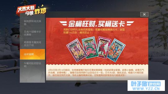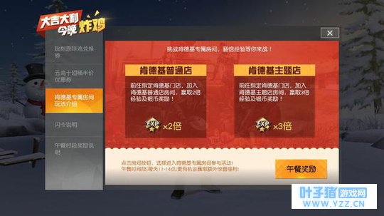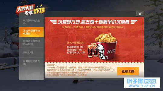 五鸡十翅 大家可以看到,第一张图显示只要2月5号你参加了专属房间的对战,并且吃到鸡,那么你就可以在现实中再吃一次鸡!简直太赞!第二张图的要求更加简单,只要参加了对战,就有可能获得五鸡十翅的半价优惠券!