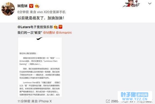 在今天的微博中,lstars电子竞技俱乐部说道,Armani战队换了一个名字,同时宣布了第二件事就是迎来了新的合作伙伴——鹿晗先生。luminous stars中文译为“闪耀之星辰”,但是星不止是闪耀,同时也代表着责任和肩上的担子,希望lstars电子竞技俱乐部在鹿晗的加入后,能够帮助中国电竞走的更远。希望鹿晗的人气可以使更多的人关注电竞,这个在家长心中不学无术的领域,让那些更爱游戏和电竞的孩子可以光明正大而不是偷偷摸摸地玩游戏。