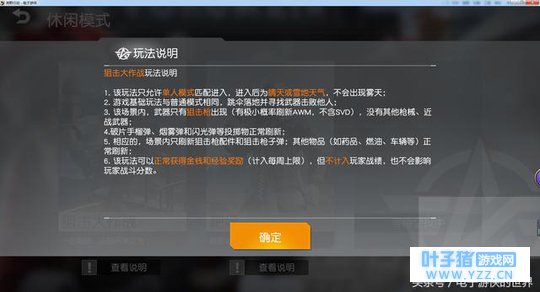 唯一与普通模式不一样的,就是地上的所有武器,全部换成了狙击枪,只能用狙击枪和其他玩家对战。其他内容都是一样的。这就是所谓的狙击大作战的休闲玩法了。