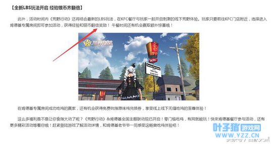 公告中写道:开启了一种全新的玩法:LBS,在游戏期间(2月4日~2月10日),玩家只要前往KFC门店附近,选择进入肯德基专属房间即可参加活动,获得双倍经验和银币奖励,并且在午餐期间还有意外惊喜哦。