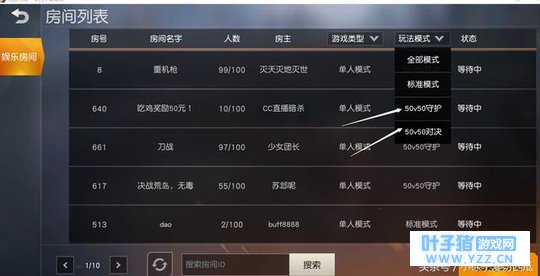 我们要搞清楚的问题是,荒野行动在2月1日更新之后的全新模式——50V50模式的入口到底在哪里呢? 首先,大家在登录游戏之后,点击一下模式切换按钮,选择房间。 大家就可以看见里面有很多房间,大家点击一下右上角的模式玩法,就可以看到“50V50守护“和”50V50对决”两种新模式! 从这里大家也可以看出来,