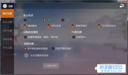 从<荒野行动>手游上线的第一天我就下载了,进行游戏,总体体验还好。但是总是觉得FPS游戏在手机上操作不是很方便。直到<荒野行动>推出了PC版,就第一时间下载试玩。总体感觉还不错。不吃电脑配置,有网就能玩。 一、基本设置 基本设置里面我主要是设置了准心和镜头灵敏度。 准心由于我受CS的影响我先的是十字中心带点的这个。但是这个准心有一个问题,就是在连射的时间会扩大很多。而第三种圆圈中心带点的没有这个问题。所以我推荐大家用第三种。