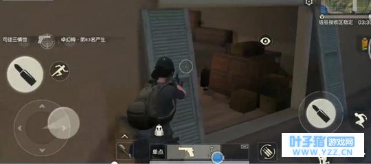 然后他窗户跳下去,去舔包。在舔包的时候,被击杀敌人的大哥来了。这位玩家手中只有P9,正面开战只能被击杀了。所以他施展了飞檐走壁,从侧面飞到了阳台上,后面偷袭这位大哥。