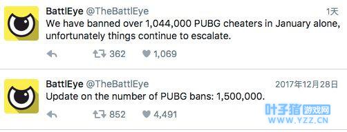 Twitch上热门游戏直播观看人数排行 虽然说国外情况和国内有别,很多老外因为《绝地求生》外挂太多的原因,都选择退出而不再玩。 最近给《绝地求生》提供发作弊系统的BattlEye官方公布了今年1月份使用外挂的封禁人数,不敢想象啊——截止2018年1月底,封禁外挂游戏者超过104万人。