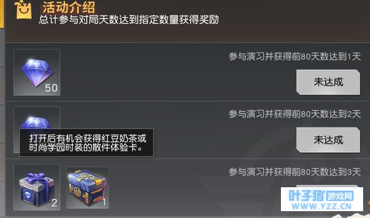 完成指定的游戏对局要求可以获得不同的奖励,三天可以领取到两个钻石礼包和一个皮肤宝箱,不过看文字说明只是散件的体验卡,网易这是准备向农药看齐,以后活动送各种时装体验卡了么?