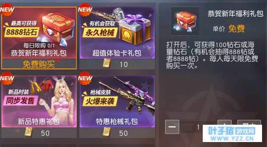 商城中新出了几个道具,特别是一个新年福利礼包,最低可以获得一百钻石,每天限量领取一个,几率开出888钻石或者8888钻石。持续时间未写明,总之大约到春节后大概有两周多的时间。
