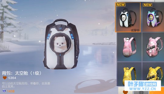 商城内的背包和降落伞都根据狗年新春而退出新款皮肤,背包是以太空舱的样式设计,三种背包都有一只可爱的狗狗模型,会轻微摇摆,应该没有互动设定。