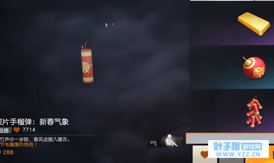 近战武器和投掷物也终于有了皮肤,板砖变成了金砖,手榴弹、烟雾弹和闪光弹都是换成了爆竹的模样。另外推出了一个新的娱乐模式,可以在模式中直接体验这几个道具皮肤的特效。 |