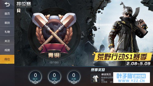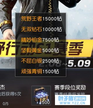 3、段位奖励: 顽强青铜:1500钻 不屈白银:2500钻 坚毅黄金:5000钻 精妙铂金:7500钻 无双钻石:10000钻 荒野王者:15000钻 (钻石奖励会在赛季结束时,通过邮件发送,S1赛季5月9日结束)