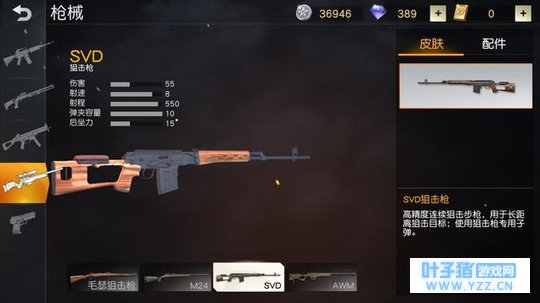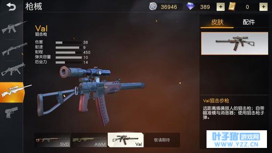 新更新的狙击枪 ,对比另外一把连狙SVD,满配情况下,可以说除了射速之外,SVD是完爆val的。但是,这把狙击枪自带消声器和四倍镜哦,你们知道吗?前期没有其他狙击枪的情况下也是一个不错的选择,如果步枪没有倍镜的时候,这把枪的特色就展示出来了! |