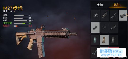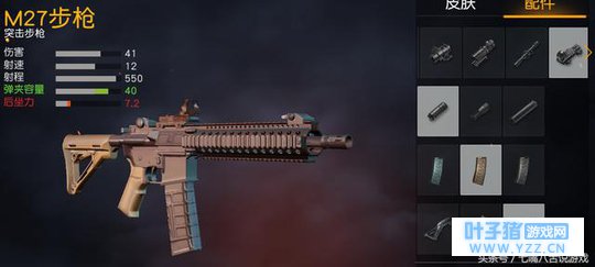 通过面板数据我们可以清楚的看到在满配的状态下95式与M27步枪的属性对比 95式步枪满配状态下,伤害43,射速12,射程550,弹夹容量40,后坐力6.5 M27步枪满配状态下,伤害41,射速12,射程550,弹夹容量40,后坐力5.8 从面板数据上来看,两把枪可以说的上是平分秋色,不相伯仲。95式在伤害上稍微的胜出一点,不过相比于伤害上的差距,M27在后坐力上可以说是完全掉打了95式的后坐力! 在这里,需要重点说明的是,面板数据的M27其实并不是真正的满配状态下的后坐力,因为实际使用中的M27是可以装配总共5个配件的。没错,就是图中红框圈起来的配件,之前MK5冲锋枪独占的枪托,现在M27也是可以装配的。