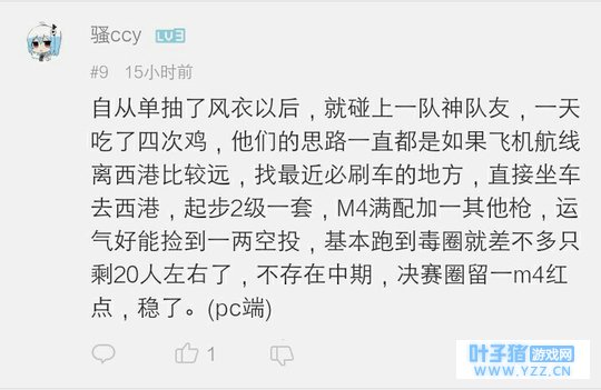 这个游戏在后期,是要技术也要运气的,有天命圈你就已经赢了一半。天命圈又是什么呢?就是最后刷圈正好刷在你脚底下,占最大优势。 在剩余10个人左右就步入后期了,这10个人技术都不一般,毕竟杀到最后的!那么,该怎么打呢? 如果有吉利服随便找个掩体蹲到决赛圈就行了,因为要吃鸡只要杀掉除你以外的最后一个人,只管怂。要是没有吉利服尽量趴在圈边的掩体后面,非常安全,总不可能后面有人冲上来吧?