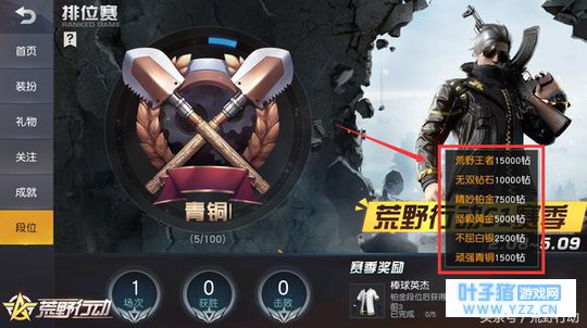 你以为段位结算只有精美的时装吗?才没有那么简单~每个赛季结算后,根据当前赛季段位会给玩家发放 相对应数量的钻石 ,最高可达 15000钻 !也就是说,实力越强获得的钻石越多哦。这么多钻石,想怎么花怎么花,心动不心动?还在愁没有足够的钻石吗?这一次,真的一波就肥! 福利都有这么多了,你还在等什么?一起迎接荒野行动全新赛季吧~