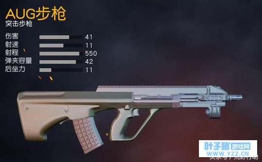 AUG 子弹型号 :小口径步枪子弹 伤害 :41 射速 :11 射程 :550 弹夹容量 :42 后坐力 :11 历史由来