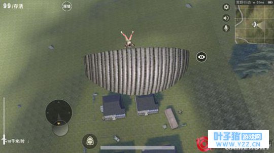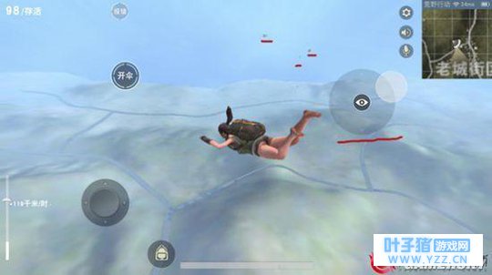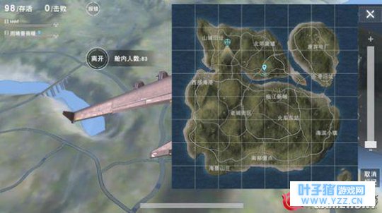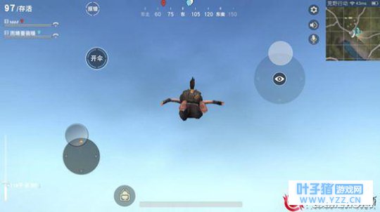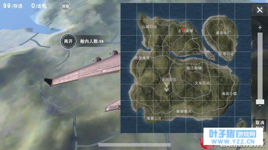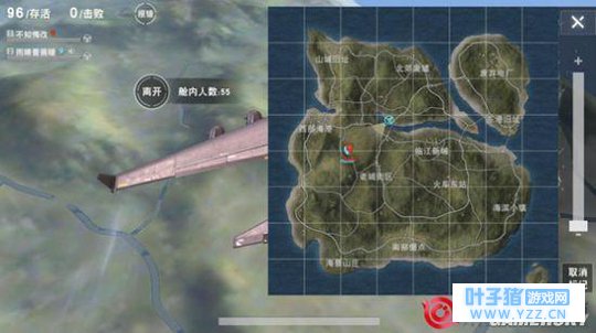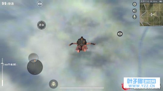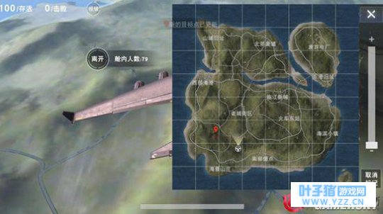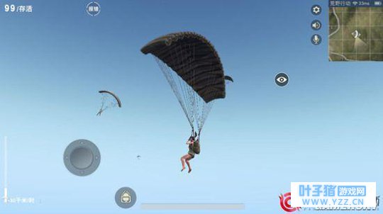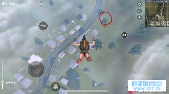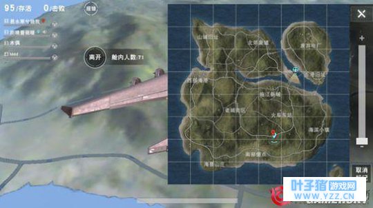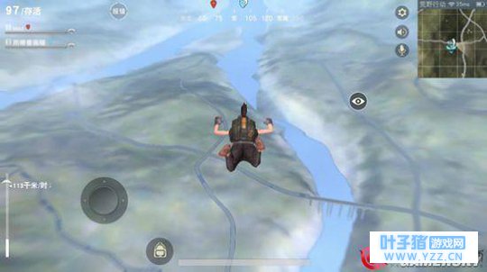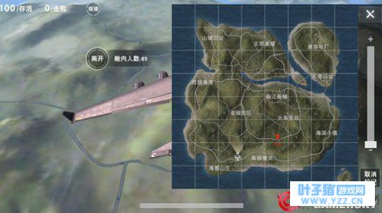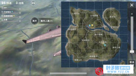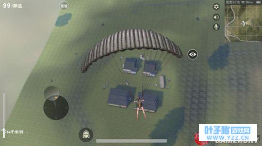 然后同时拖动方向的上以及小眼睛的上,会快速滑翔,具体飞的距离,看你滑的位置及时调整~如果没有滑到指定地点,可以观察四周有白点方向就近降落捡一波,再冲过去,毕竟远距离人是很少滴~ 每个人选择降落的地点不同,如果想观察大部队在哪里可以看离开按钮上显示的人数,并且定一个远一点区域,灵活选择降落地点: