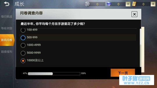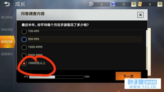 玩家告诉我,自己在游戏刚开始之际,填写了一个来自系统的问卷调查,在游戏数据调查中,玩家填写了一些并不相符的信息,比如在游戏中的充值流水,玩家选择了1万元以上,可能正是因为填写了充值信息的缘故,在进入游戏之后,玩家便开始各种福利。